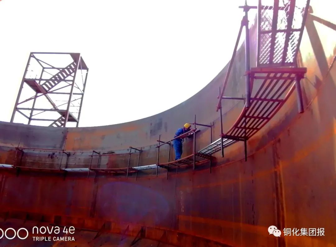 為促進(jìn)礦山綠色發(fā)展,新橋礦業(yè)公司投資近2200萬元,對全尾砂充填系統(tǒng)進(jìn)行技改。該工程于2月動工,預(yù)計7月底收官運行。屆時,選礦廠、選鐵廠生產(chǎn)尾砂及污水處理站淤泥經(jīng)混合處理可全部用于井下充填,實現(xiàn)礦山生產(chǎn)固廢零排放。圖為5月21日,工人正在施工現(xiàn)場焊接直徑18米的深錐濃密池?!√丶s記者/ / 朱常林/ / 攝